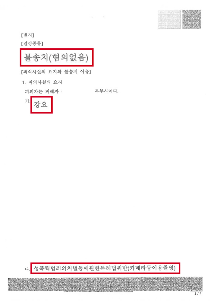 » | [불송치] 강요/카메라촬영죄 | 초대남을 불러 아내와 관계를 강제로 하도록 한 사건, 무혐의 | admin | 2025.10.21 | 4 |