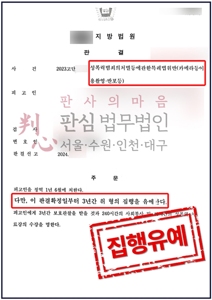사건을 담당한 법원은 변호인의 의견을 받아들이며 2건이나 적발된 불법촬영에 대해 이례적으로도 집행유예 판결을 내려주었습니다.