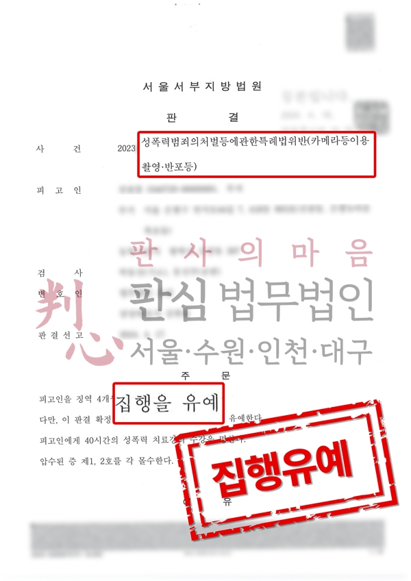 5 | [집행유예] 카메라촬영죄 | 카메라촬영죄 수사 중 재범을 저질러 실형 위기였던 사건, 집행유예 | admin | 2025.10.21 | 5 |